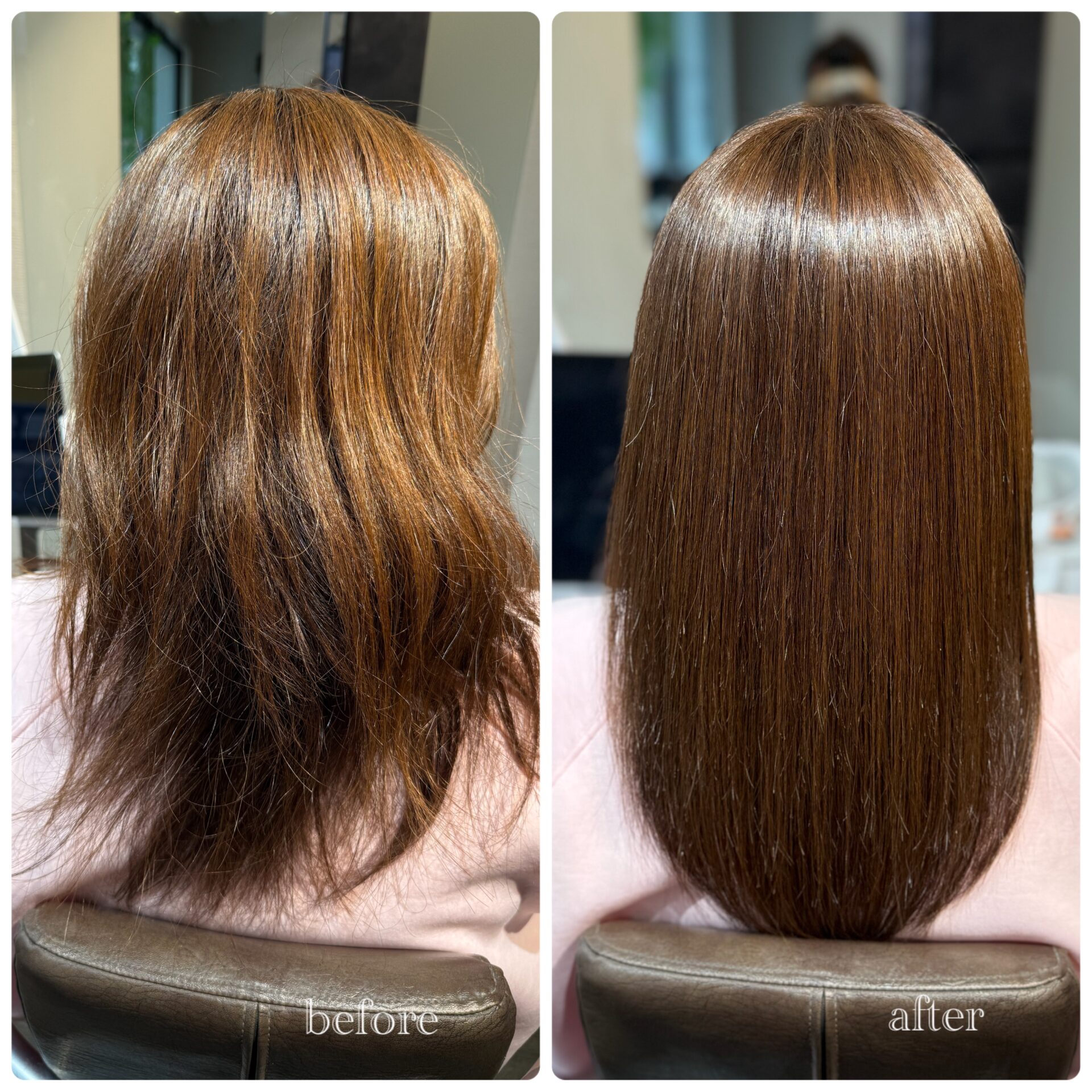 シルクトリートメントでは水分、油分、タンパク質をしっかりと補い、美しいまとまりのある絹髪にさせていただきました!